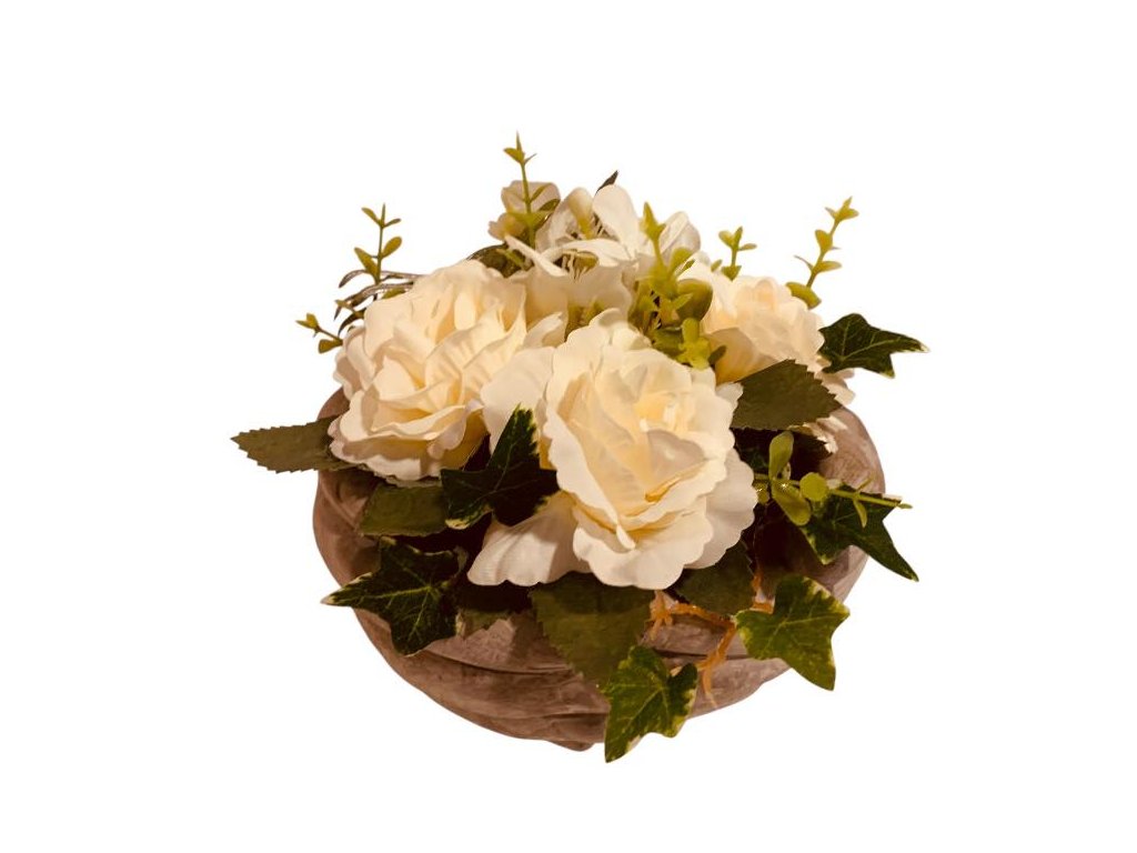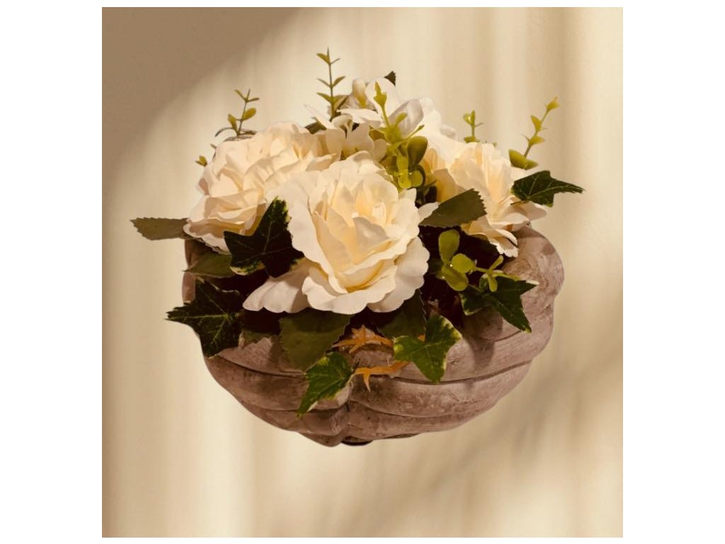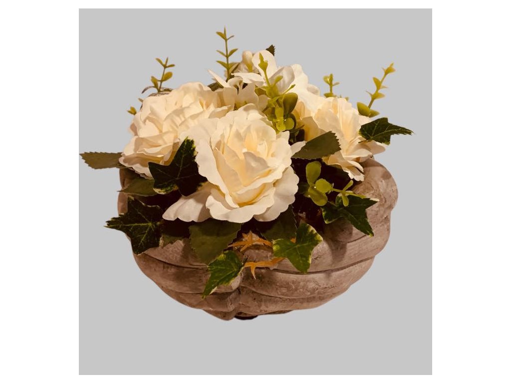 Smuteční dekorace mrazuvzdorná - květiny - květináče - ruce beton a bílé růže,pr.17cm