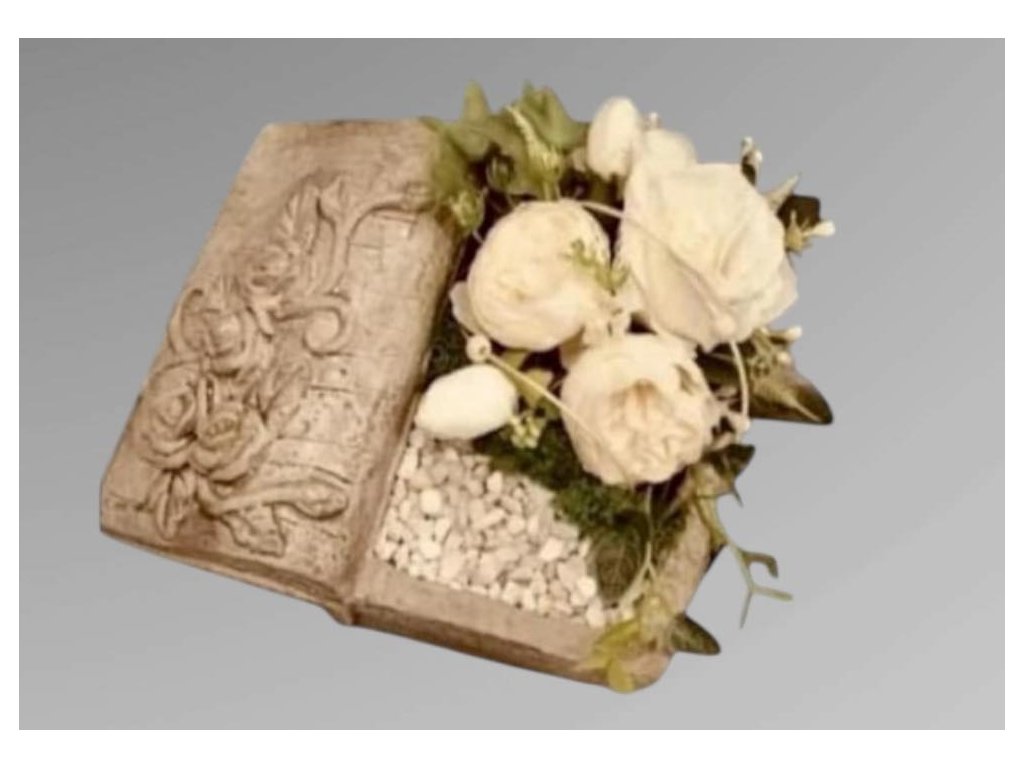 Materiál kniha: nádoba ve tvaru knihy s reliéfem z mrazuvzdorné cementové směsi z naší dílny.