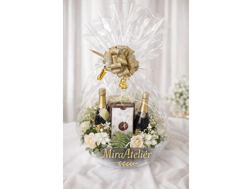 Vše zabalené do dárkového celofánu se stuhou.