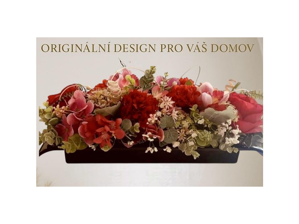 5. Červené látkové květy - mix - nádoba dřevěná z naší dílny (vrstvený velice dekorativní tác)