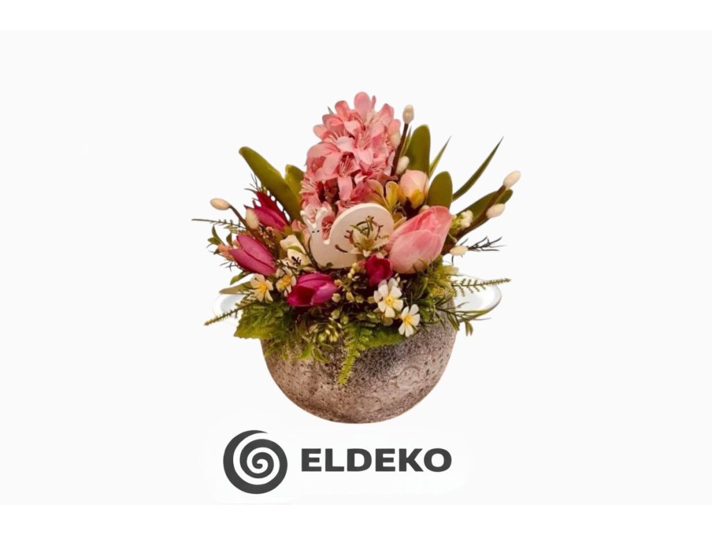 Materiál: betonový obal ve tvaru skořápky, látkové květy jarních květin, umělých tulipánů a ostatní umělé zeleně.
