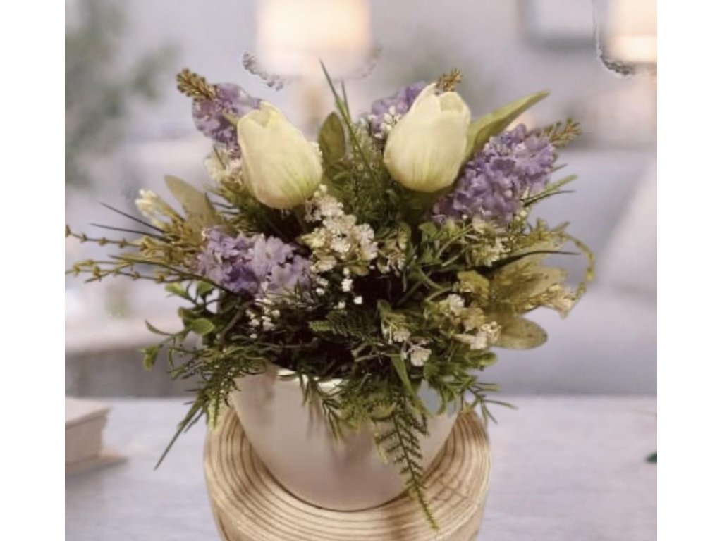 Jarní dekorace s tulipány - v keramickém obalu, v. 30cm