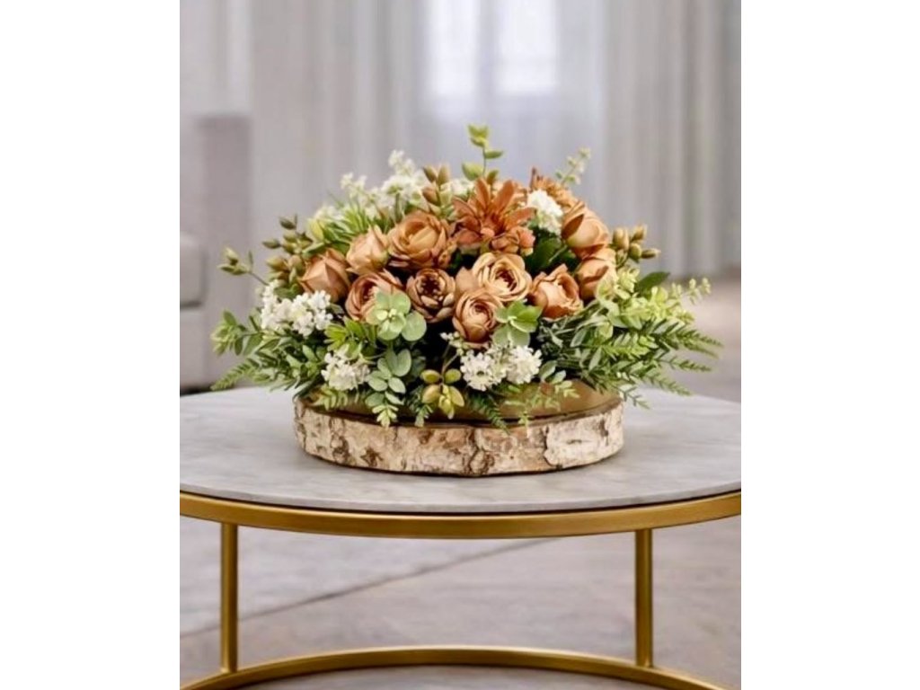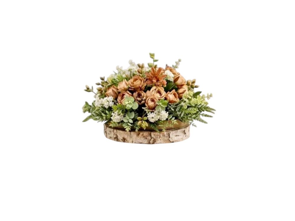 Květinová dekorace na dřevěné podložce,pr.30cm
