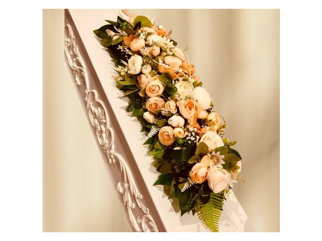 Materiál: podklad je plastová podlouhlá aranžovací miska zelená, látkové květy laděné v barvě světle oranžové až lososové a bílé, ostatní umělé doplňky.