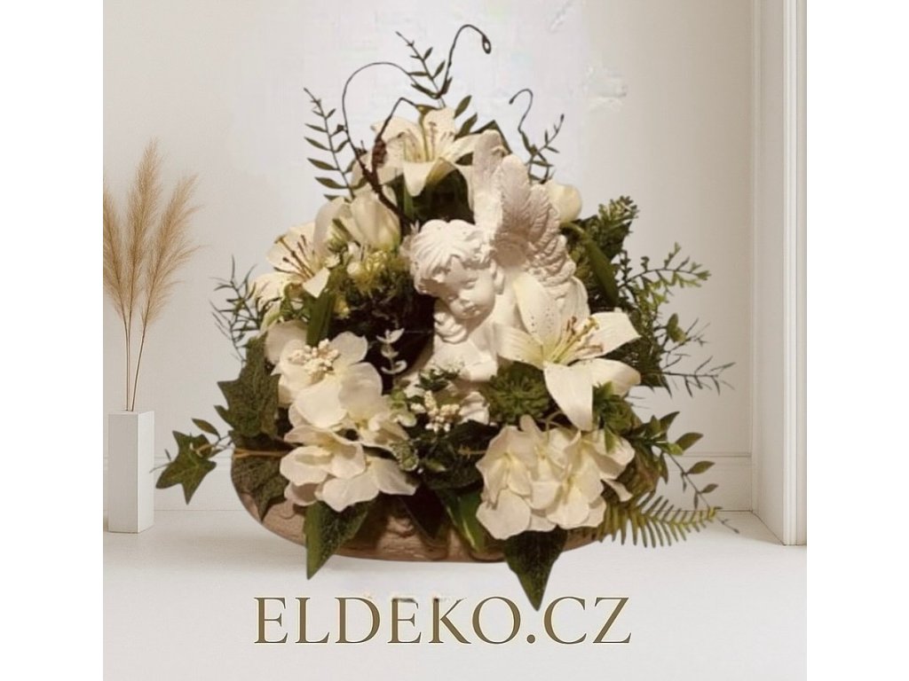 Materiál: anděl a betonový ovál z mrazuvzdorné směsi z naší dílny, látkové květy růží, lilií, hortenzií a dalšího kvítí, umělé doplňky