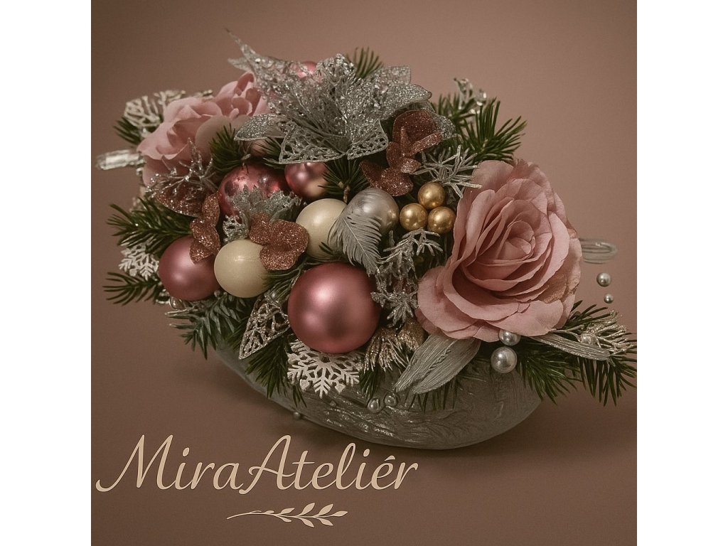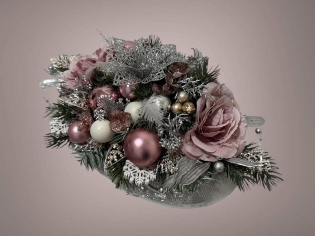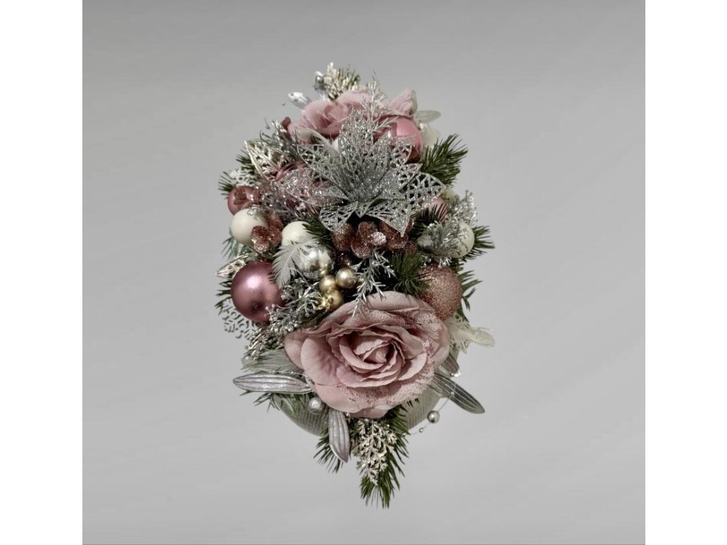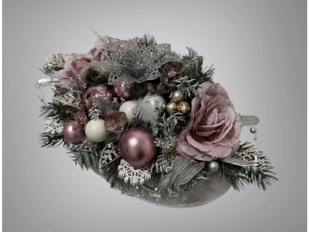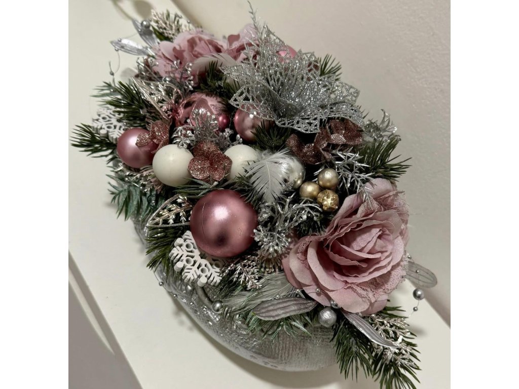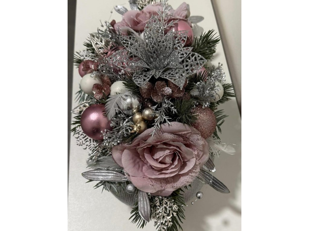 Materiál: betonový obal postříbřený, látkové květy růží, umělé chvojí s glitry postříbřené, umělé ozdoby a další doplňky laděné v barvě růžové, stříbrné a bílé.