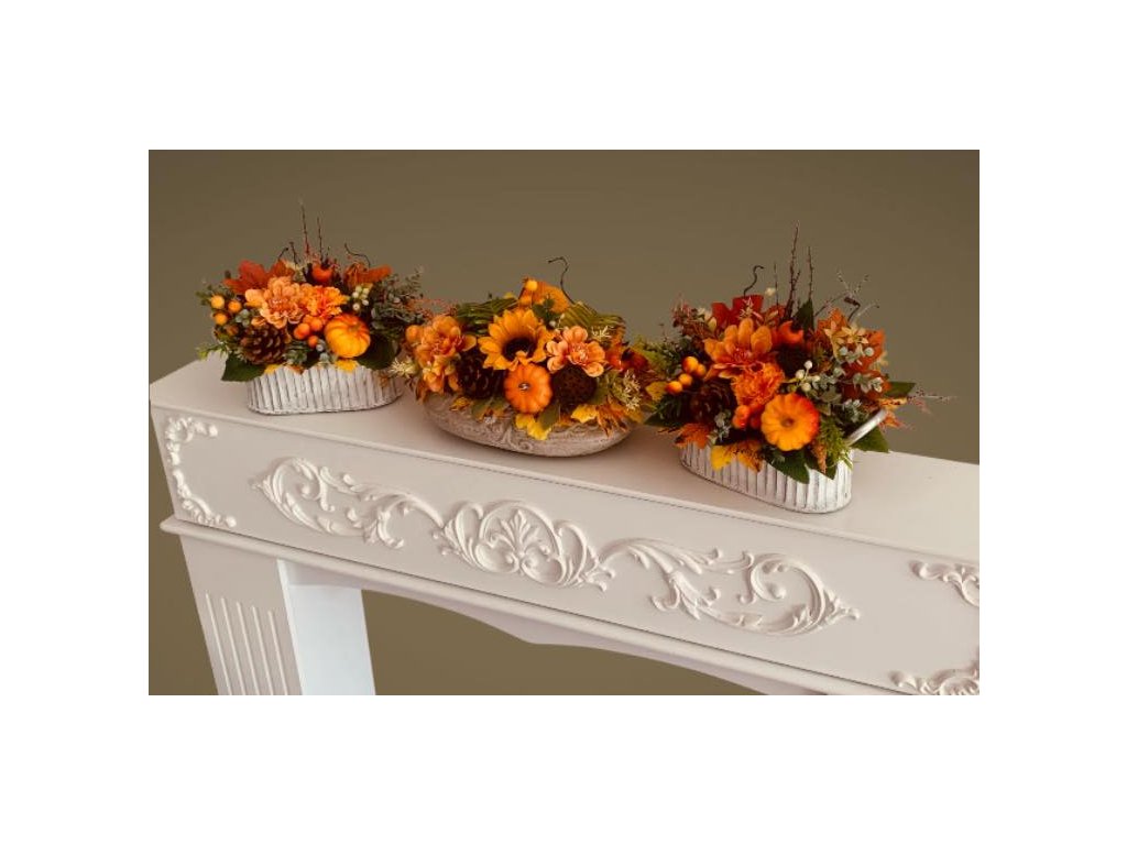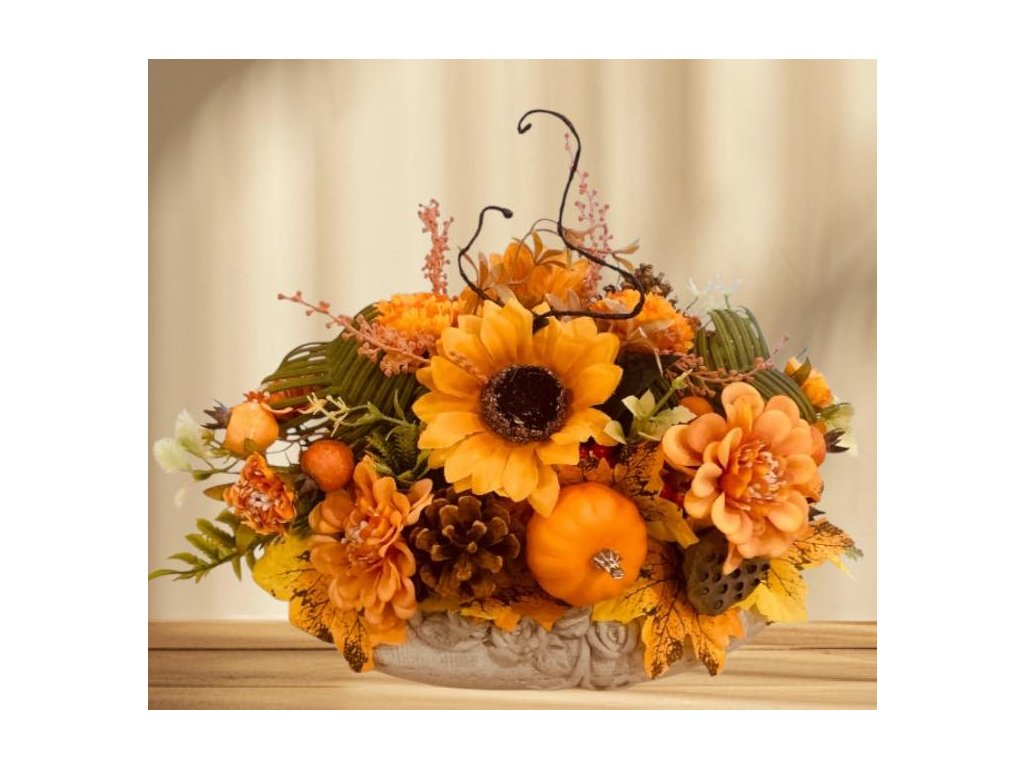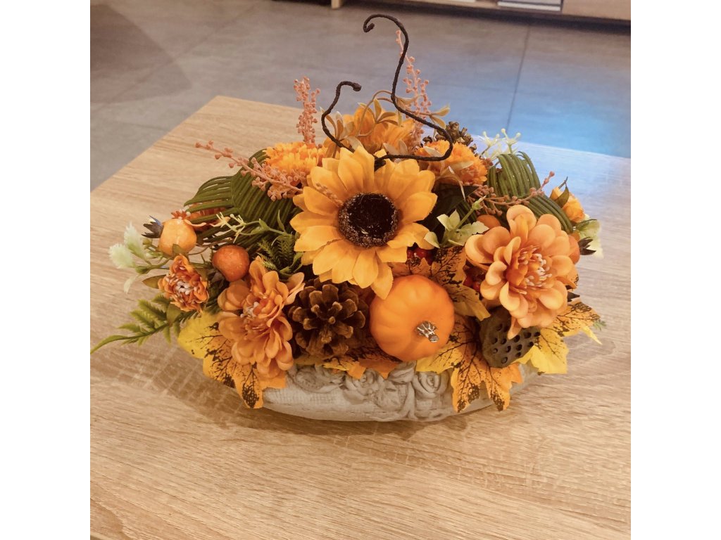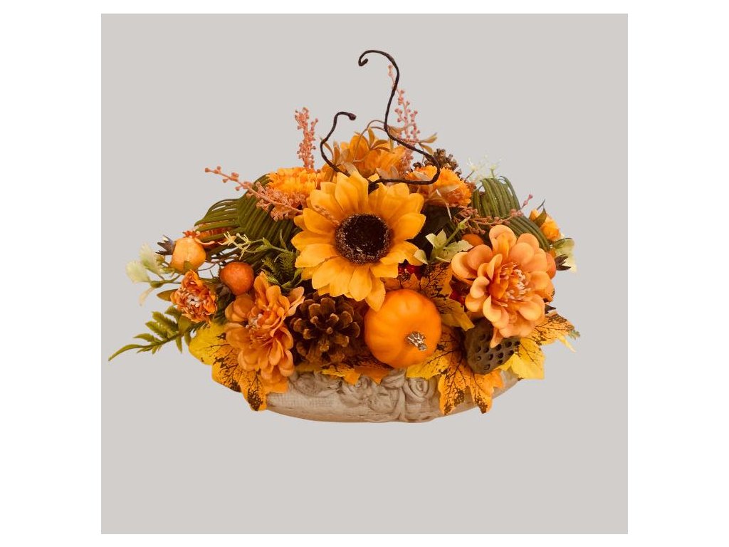 Materiál: Odlitek z naší dílny, z cementové směsi odolné mrazu, látkové květy a další umělé doplňky v teplých podzimních barvách. Umělé dýně. sušiny a přírodní šišky.