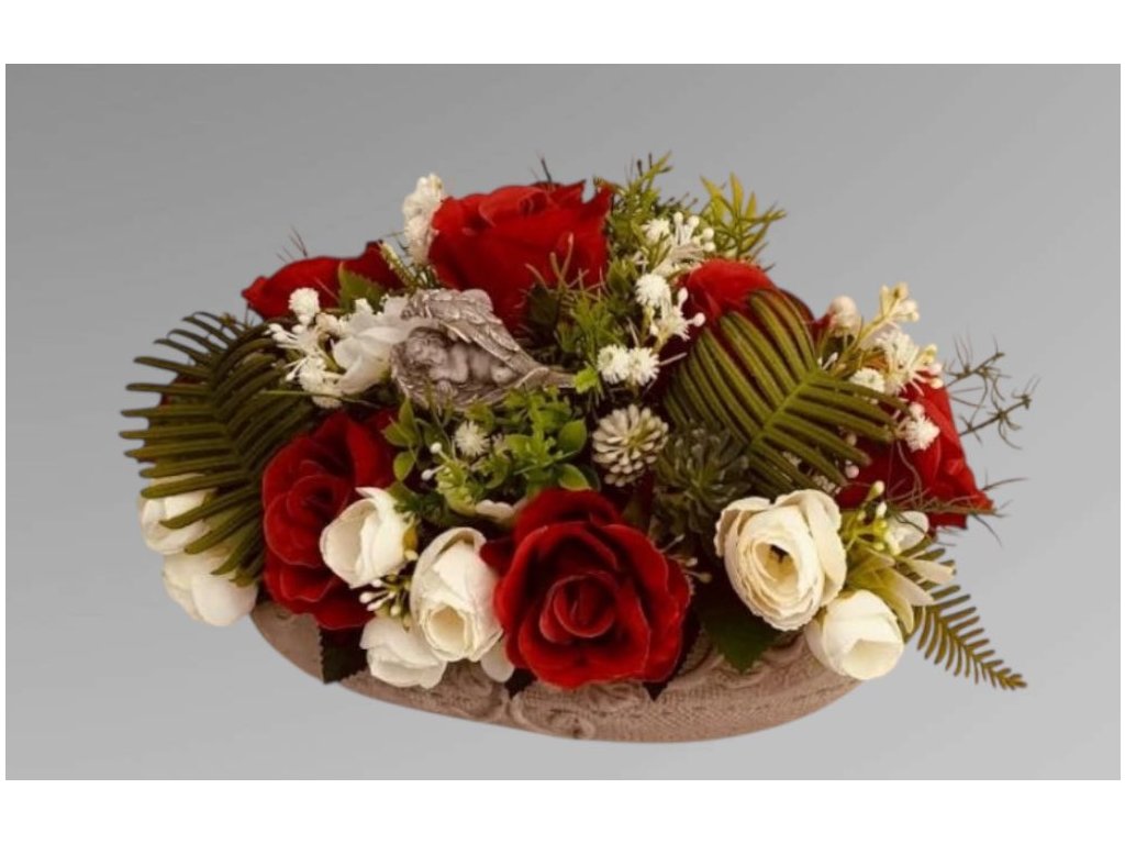 Celoroční smuteční dekorace - růže červené - anděl zápich - betonový ovál s reliéfem,d.30cm