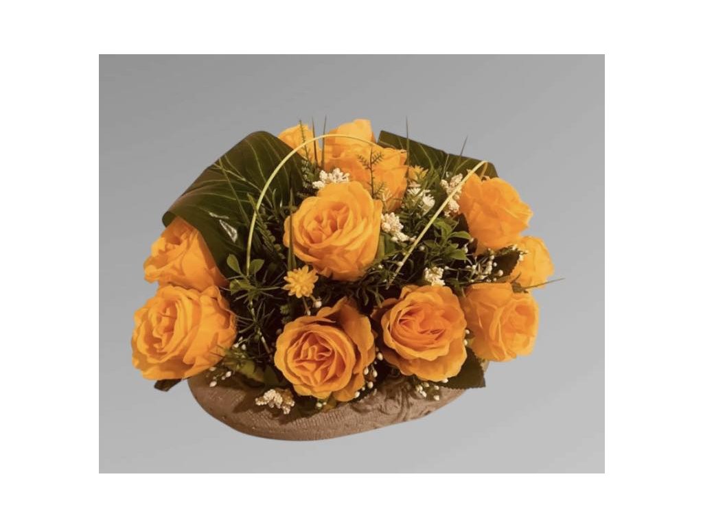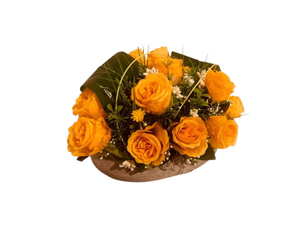 Materiál: nádoba z mrazuvzdorné cementové směsi, látkové květy žlutých růží, ostatní umělé doplňky.