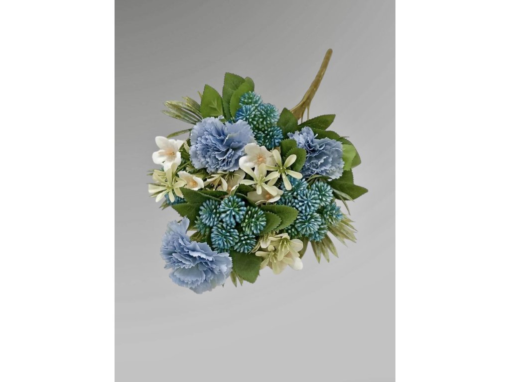 Kytice - sv. modrá, karafiát + bodlák, na položení,d.44,5cm