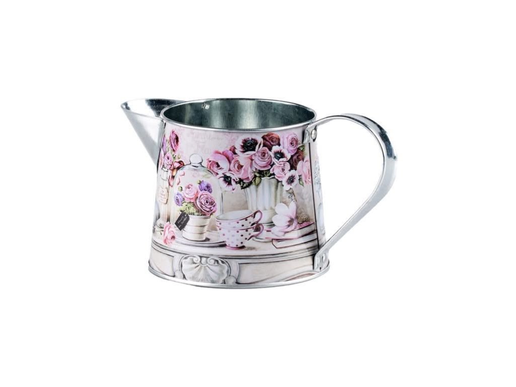 Plechová malá konev v barevném provedení - vhodná jako dárek i pro další aranžování.