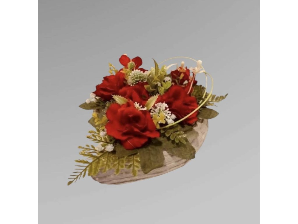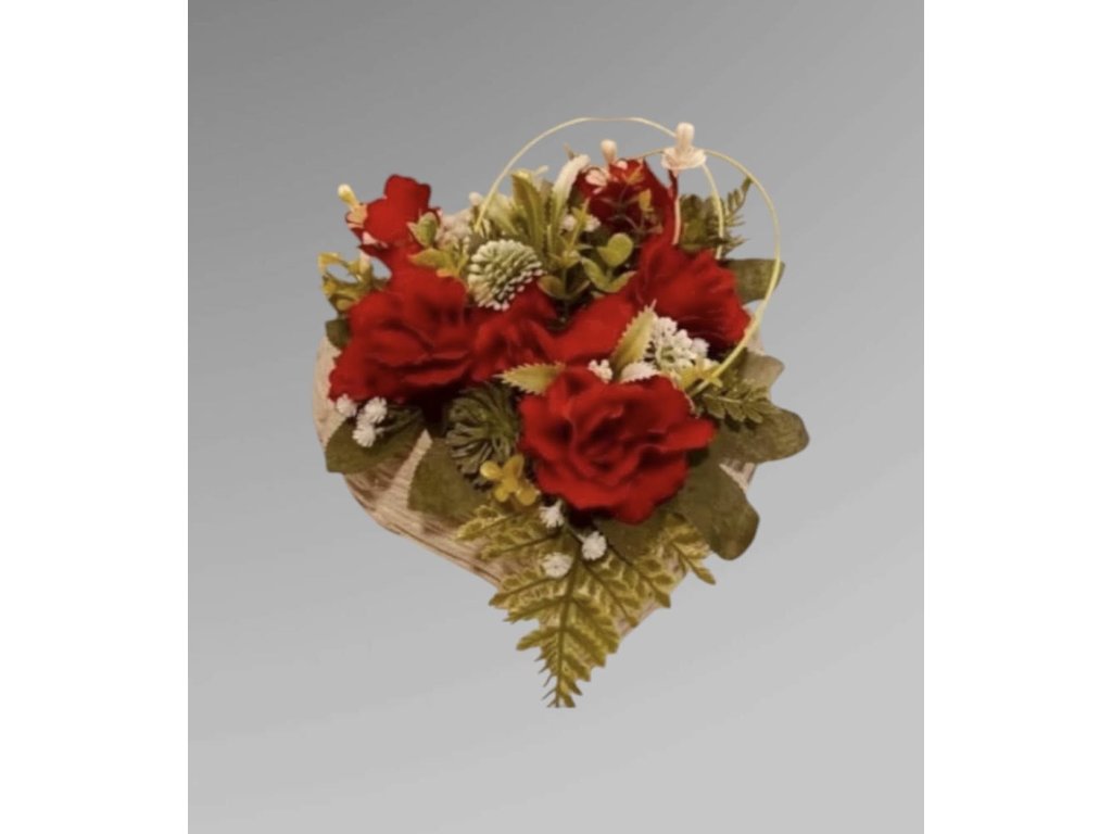 Materiál: nádoba ve tvaru srdce s křídly z naší dílny, látkové květy a ostatní umělá zeleň.