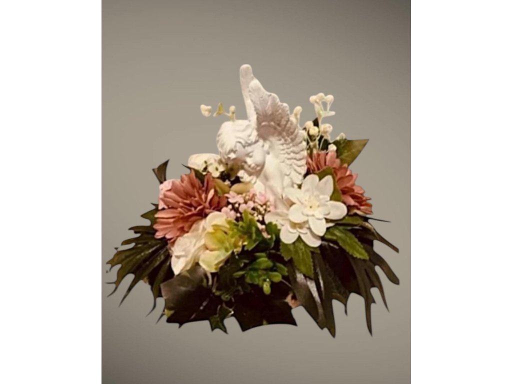 Smuteční dekorace - květiny - anděl na dřevěné podložce - mrazuvzdorné,d.30cm