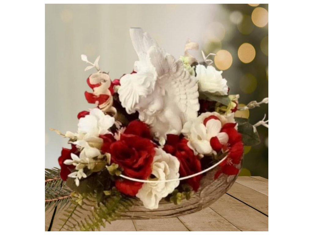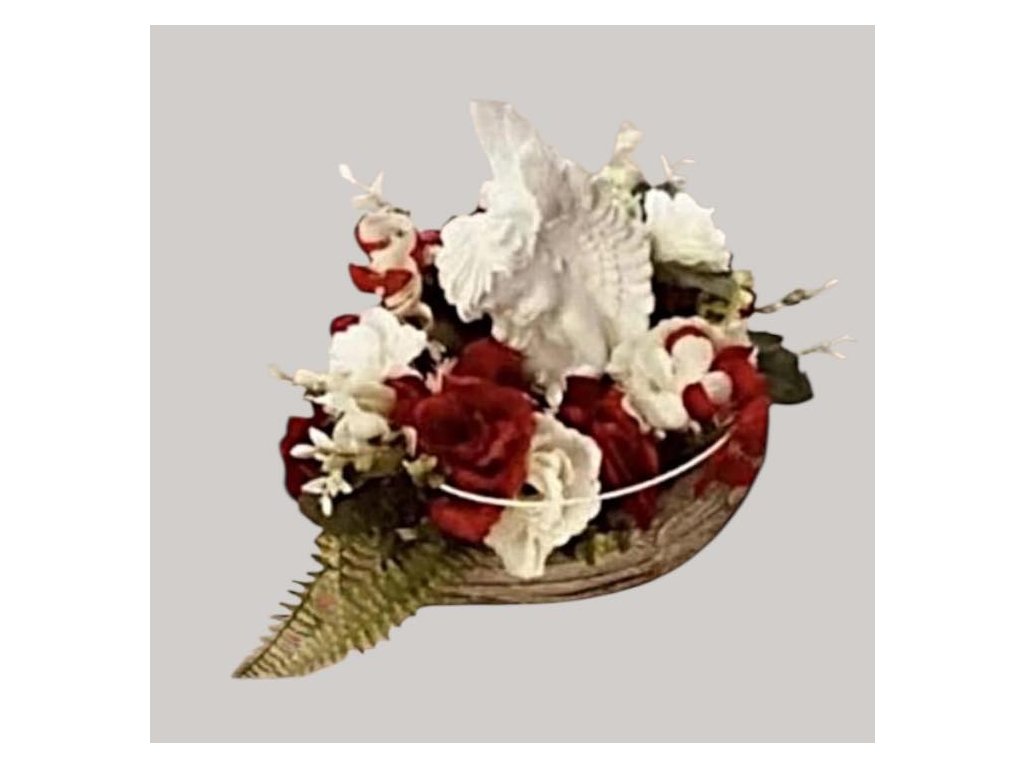 Materiál: umělé rostliny, látkové květy (červené a bílé růže), beton, andělíček, pedig doplňky.