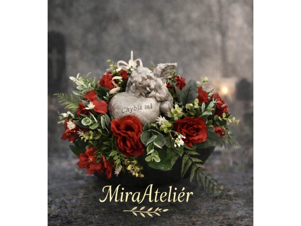 Smuteční dekorace ručně vytvořená v naší dílně – jemná kompozice z kvalitních látkových květů doplněná andělem s osobním textem, vyrobeným z mrazuvzdorné cementové směsi. Důstojná a trvalá vzpomínka, která s citem vyjadřuje úctu a lásku k těm, na které nikdy nezapomeneme.
