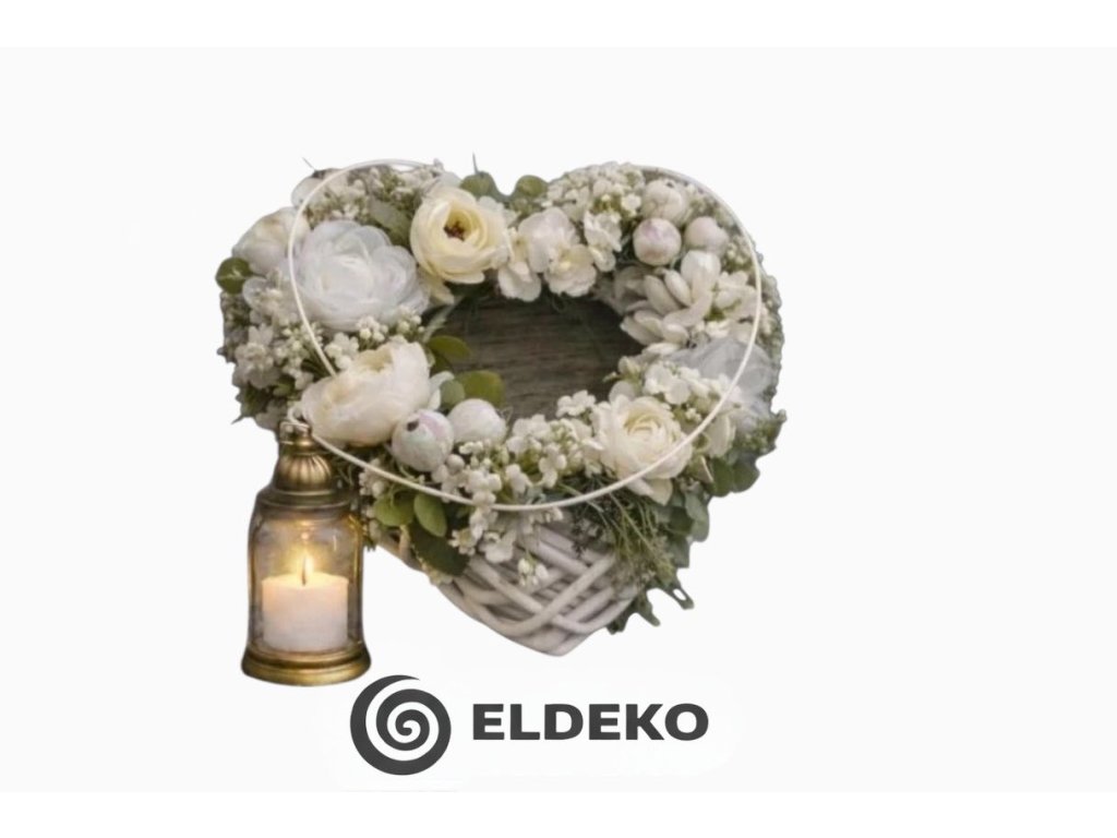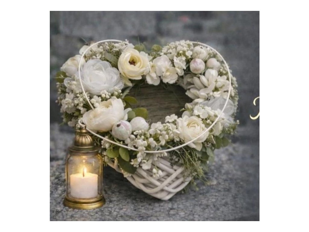 Materiál: proutěné srdce v barvě bílé, látkové květy pivoněk a dalšího kvítí, umělé doplňky