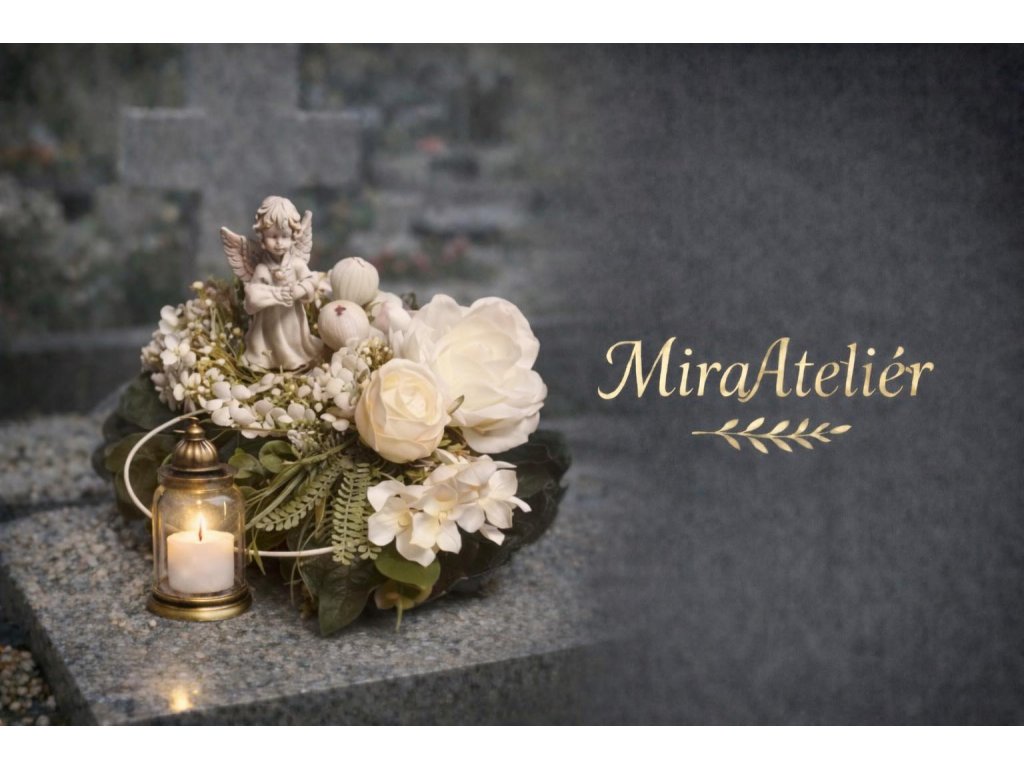 Materiál: dřevěná podložka z břízy, andělíček z naší dílny z mrazuvzdorné odolné směsi, látkové květy pivoněk a dalšího kvítí, umělé doplňky