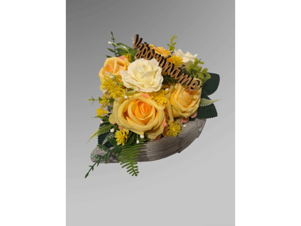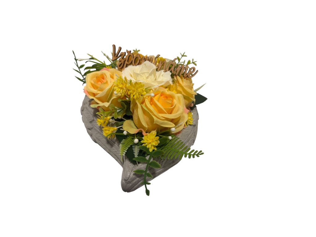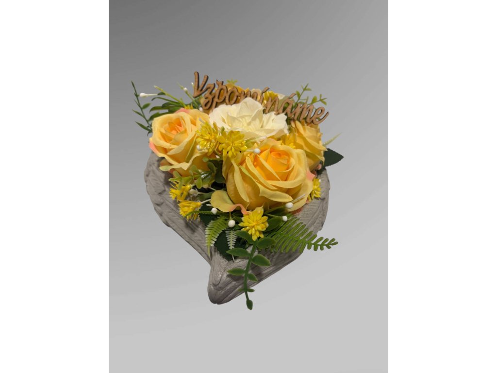 Materiál: nádoba ve tvaru srdce s křídly, kříž bílý z mrazuvzdorné cementové směsi, látkové květy žluté růže , hortenzie, umělý eukalyptus, kapradina, ostatní umělá zeleň