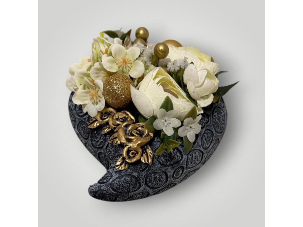 Smuteční srdce s růží zdobené - grafit, beton - zahnuté,pr.20cm