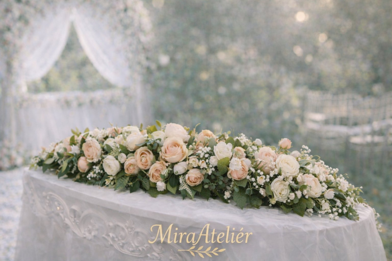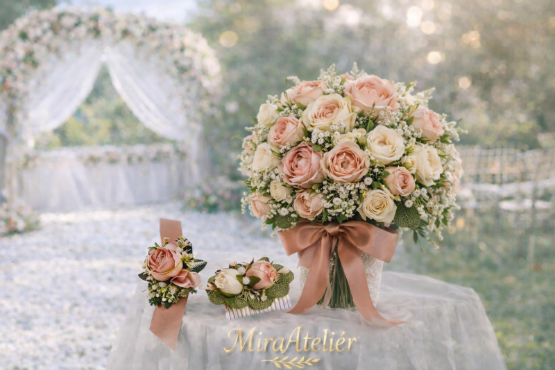Umíme vyhotovit svatební trvanlivé svatební kytice, korsáž, náramky pro družičky, čelenky, dekorování stolů a mnoho dalšího.