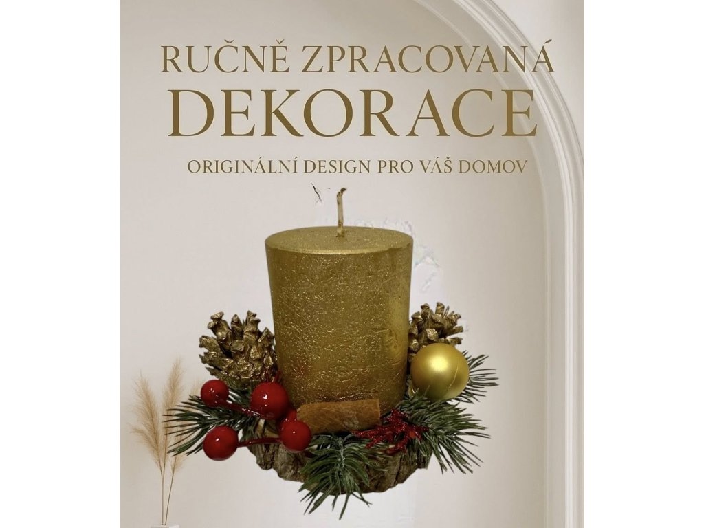 Umělé chvojí, pozlacené šišky přírodní, skořice, ostatní přízdoby v barvě červené a zlaté.
