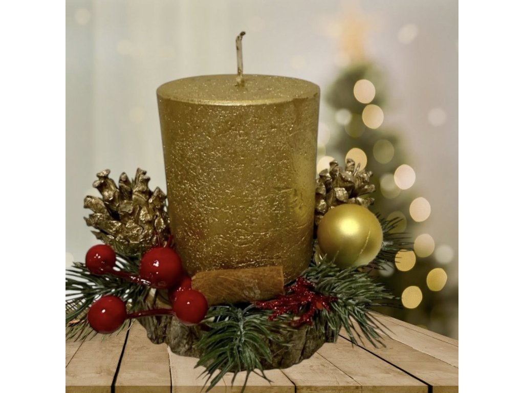 Materiál: metalická svíčka zlatá, dřevěná kulatá podložka z akátu, plechový bodec na který je svíčka napevno uchycena.