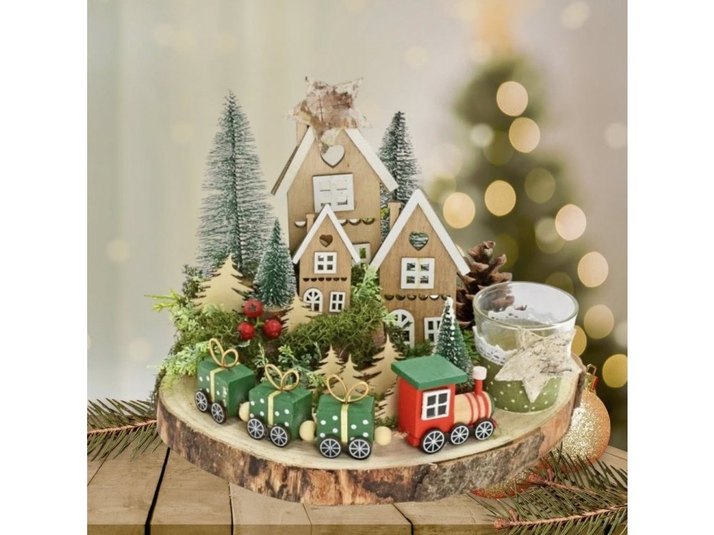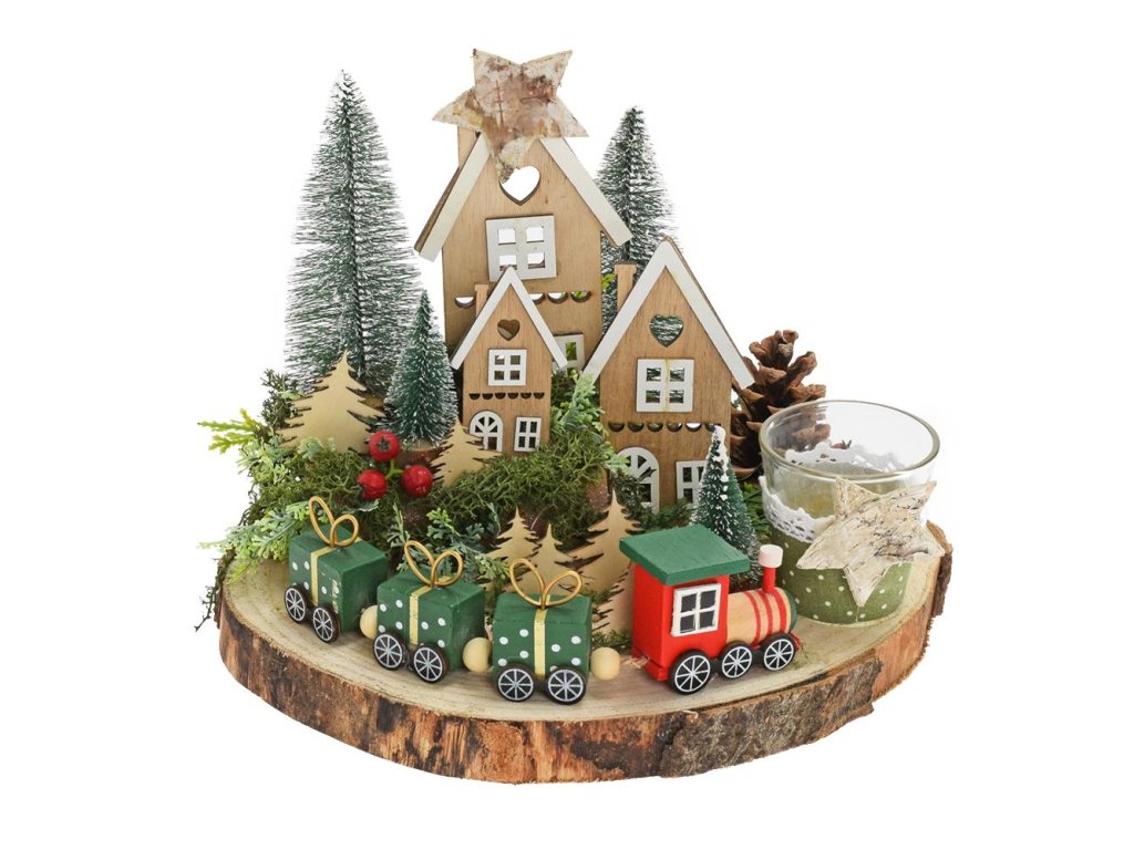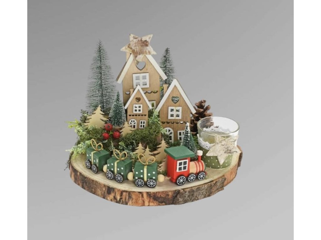 Svícen je velice krásný dekorativní prvek, který dodá vašemu domovu sváteční atmosféru. Obsahuje dřevěné domečky, malé stromečky a vlak, který je umístěn na přírodním podkladu. Tento produkt bude dokonalým doplňkem pro vaší adventní atmosféru.
