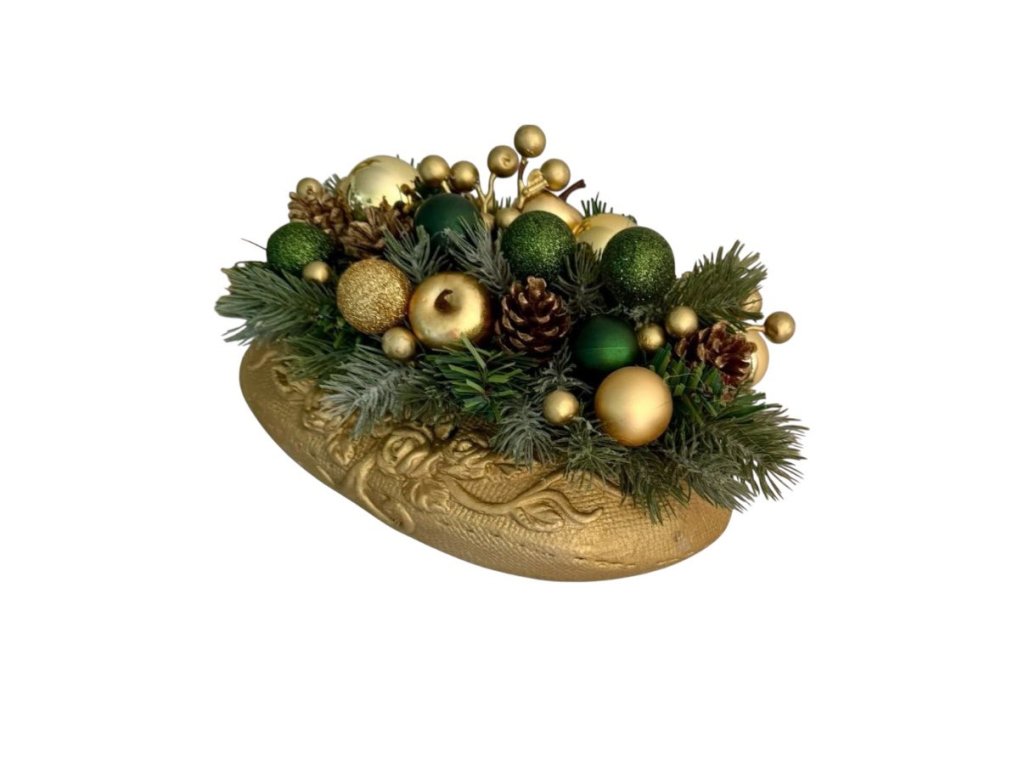 Materiál: betonový obal pozlacený, umělé chvojí, umělé ozdoby a další doplňky laděné v barvě zlaté a zelené.
