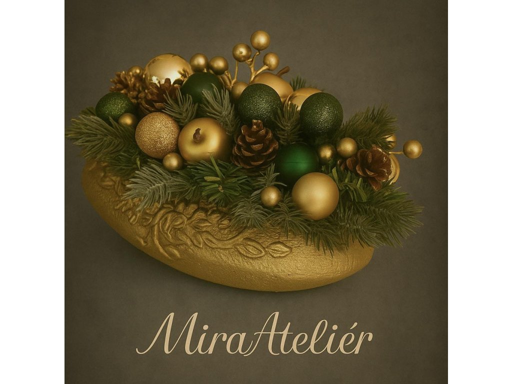 Nádherná luxusní dekorace s vánočními přízdobami laděné ve zlaté a zelené z naší dílny.